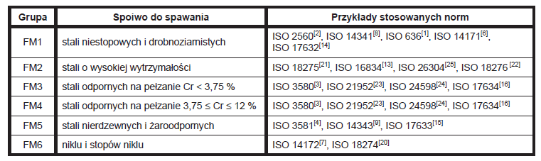 Tablica 2 z normy EN ISO 9606-1 –  Grupy materiałowe spoiw. [1]