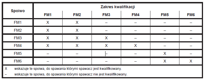 Tablica 3 z normy EN ISO 9606-1 – Zakres kwalifikacji dla spoiw. [1]